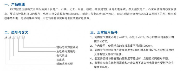 GCS低壓抽出式開關柜是兩部聯(lián)合設計組根據(jù)行業(yè)主管部門、廣大電力用戶及設計單位的要求設計研制出的符合國情、具有較高技術性能指標、能夠適應電力市場發(fā)展需要并可與現(xiàn)有引進產(chǎn)品競爭的低壓抽出式開關柜,該裝置目前已被電力用戶廣泛選用。